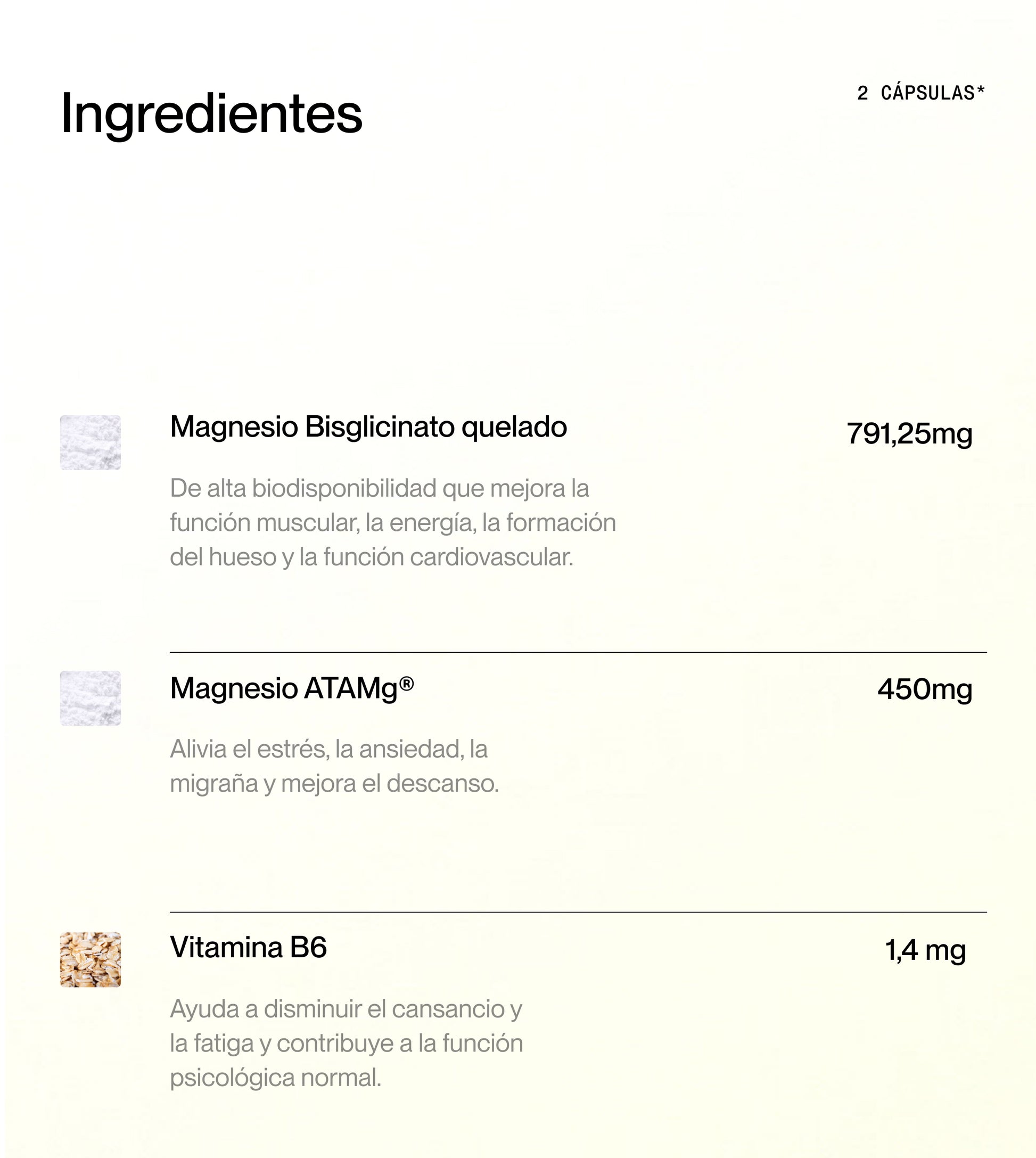 Bisglicinato de magnesio, acetil taurinato de magnesio dihidrato, fosfato dicálcico anhidro (diluyente), dióxido de silicio (antiaglomerante), sales magnésicas de ácidos grasos (antiaglomerante); vitamina B6.